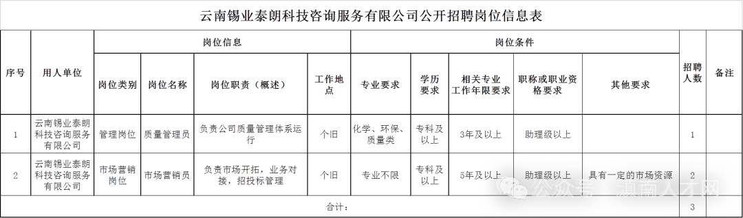 1.《云南錫業(yè)泰朗科技咨詢服務(wù)有限公司公開(kāi)招聘崗位信息表》