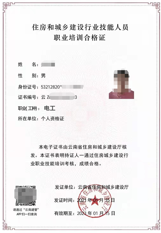 1、建筑電工證,由“云南住房和城鄉(xiāng)建設(shè)廳”頒發(fā),證書每2年進行一次“再教育繼續(xù)學(xué)習(xí)”,如果證書過期將需要重新考!