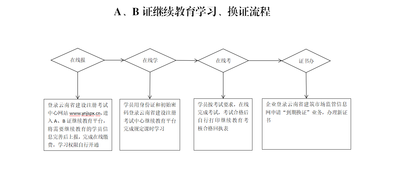 云南省建設廳安全員A、B證繼續(xù)教育學習、換證流程圖